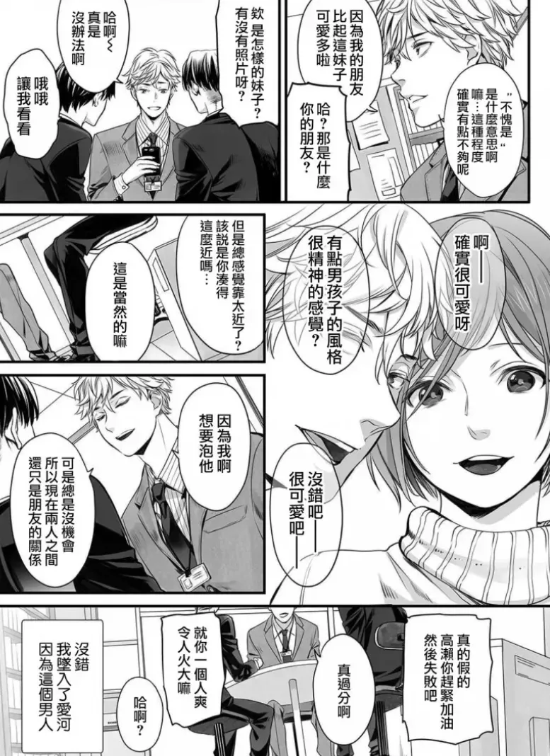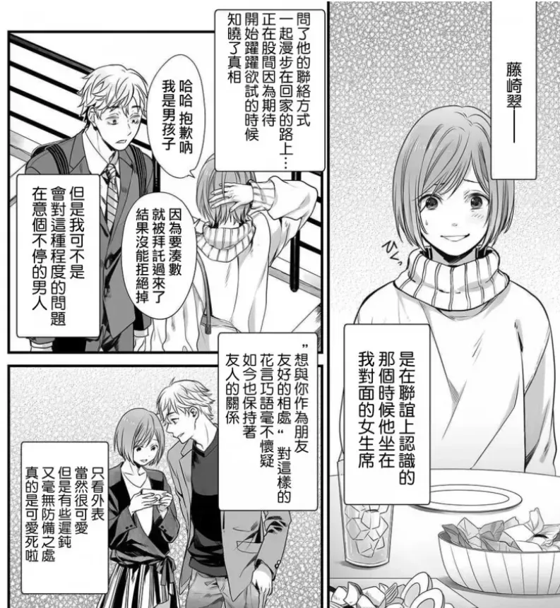 金毛的臭屁状态已经到了宫下キツネ要在两页里展示四次微表情的程度,无论是掏出手机想炫耀自己认识受时候,同事们纷纷表示“确实好看”时不露声色的得意表情,还是说出“因为我啊想要泡他”的绝对臭屁立场,以及回忆与女装受相遇时对自己的花言巧语有清晰的认知,这个角色的已经在两页之内展现出了堪称坦然的轻浮感,而同时女装受的基本信息也在顷刻间交代完成——