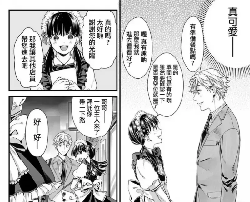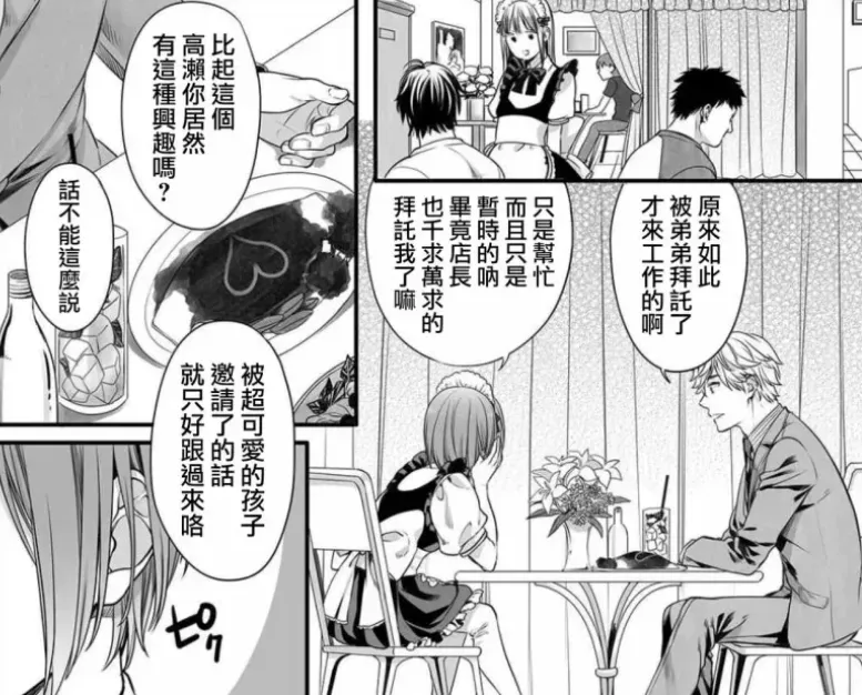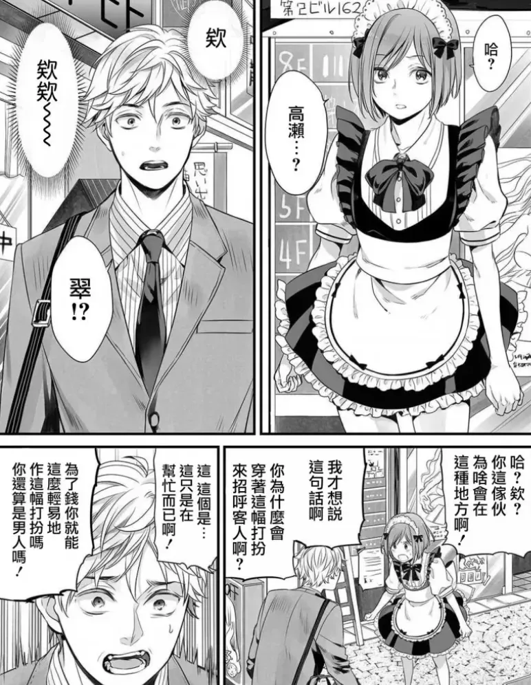 接着下班的金毛攻在街上偶遇了受的弟弟“蓝”,蓝此时正为伪娘咖啡店揽客,可没想到的是,原先已经认识一段时间的受居然就在一旁帮忙。背景有被细节地绘制出来,展现了故事内有现实逻辑的空间关系。